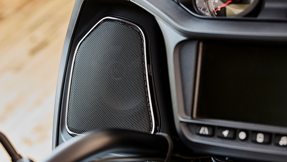 Escucha cada nota con bocinas de alto desempeño en el carenado que entregan 100 vatios de sonido claro como el cristal. Y el ecualizador dinámico se ajusta automáticamente al ruido de la carretera, el viento y el motor.